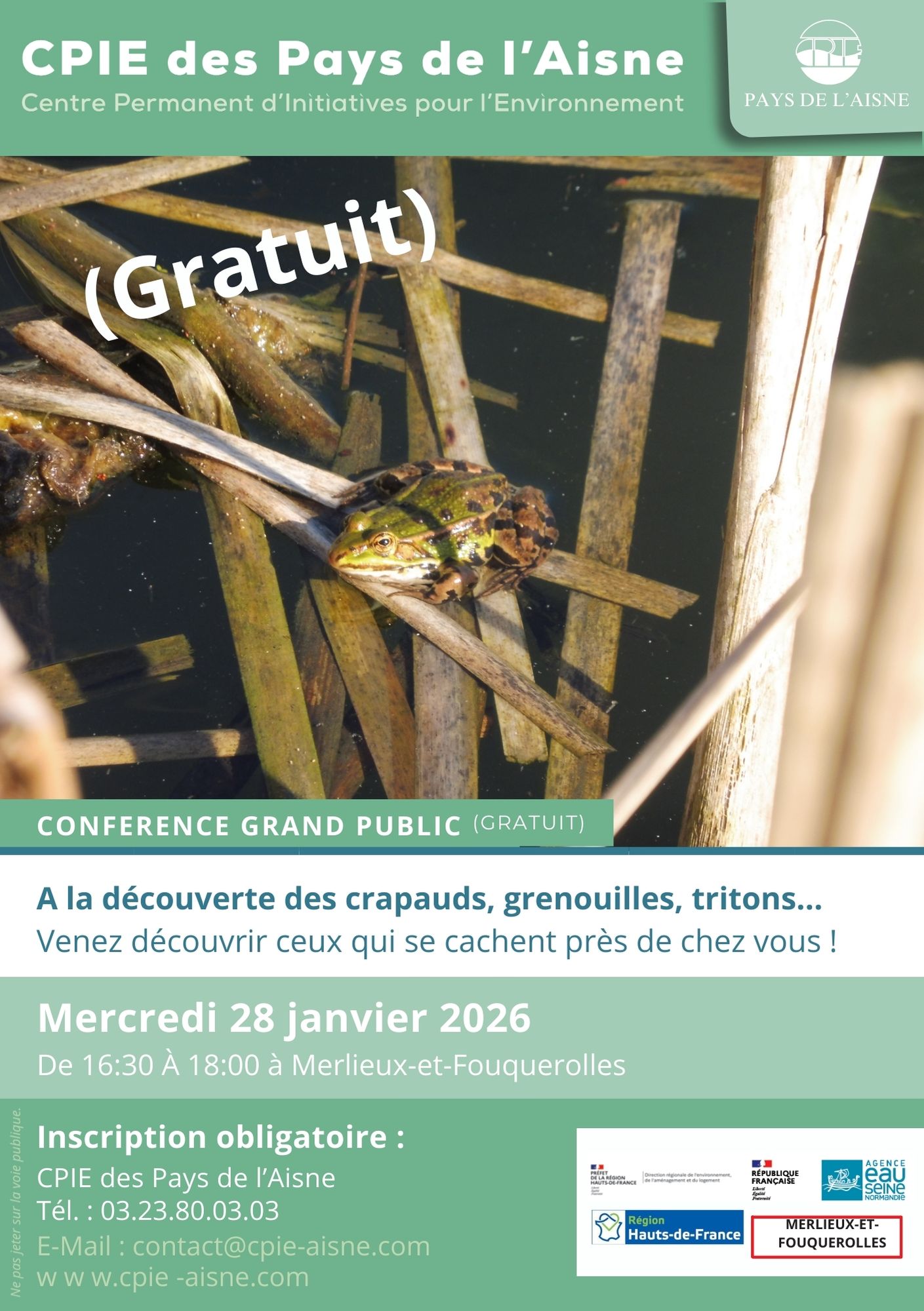 CONFERENCE "Crapauds, grenouilles, tritons" Mercredi 28 janvier 2026 De 16:30 À 18:00 à Merlieux-et-Fouquerolles